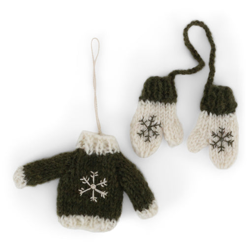 Celebrate the cozy side of the Holidays with this whimsical ornament set from Gry & Sif. The set includes a tiny green-and-white knit-style swe...