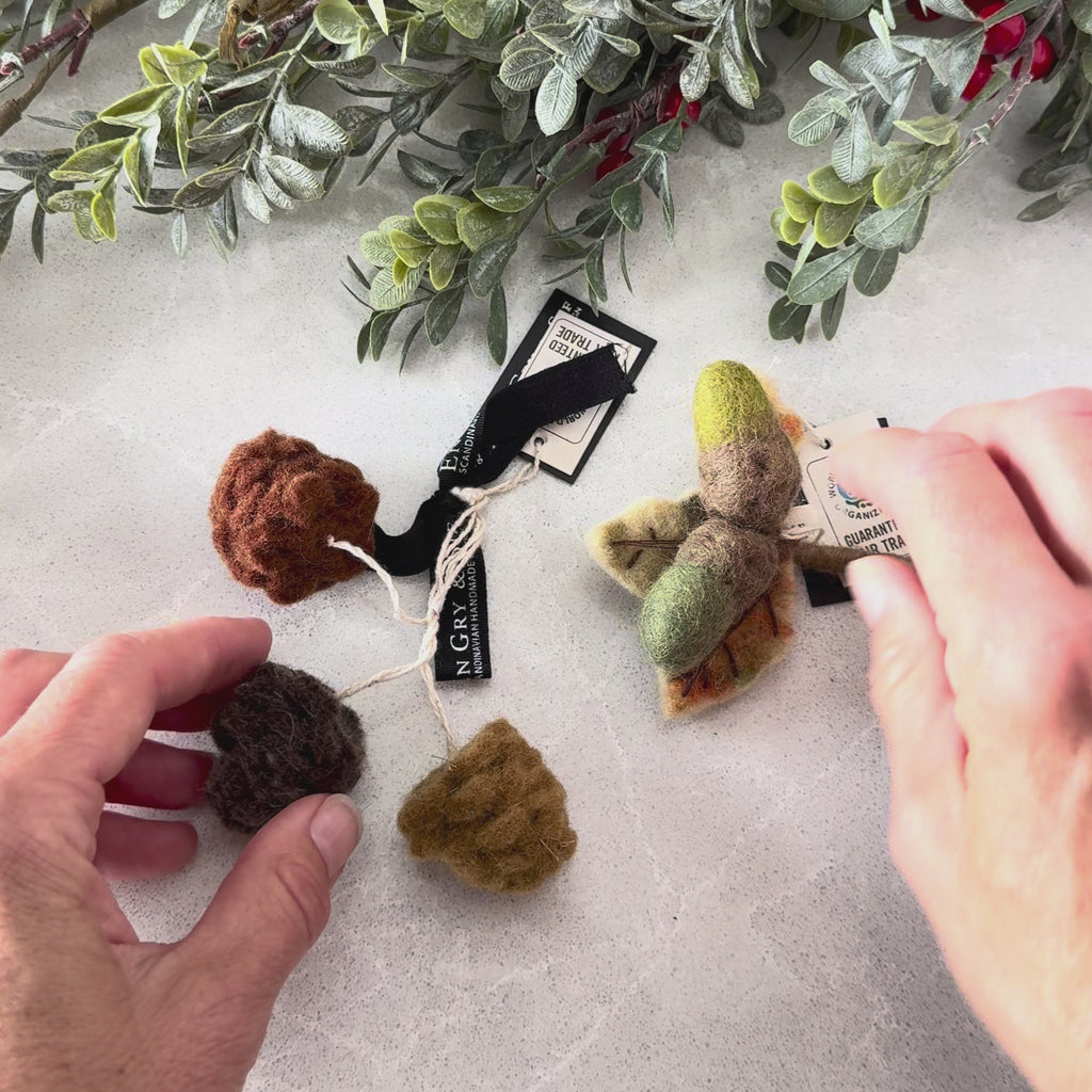 A charming trio of pine cone ornaments handmade from felted wool in Denmark by Gry & Sif. Each cone in this set of three is a slightly different shade of forest brown, adding texture and natural beauty to your Holiday decorating. At about 4 cm in diameter, these petite ornaments are perfect for hanging from one of Gry & Sif’s beautiful garlands or decorating a hanging wreath. Pair them with the Gry & Sif Acorn & Oak Leaf ornament for a woodland-inspired theme.
