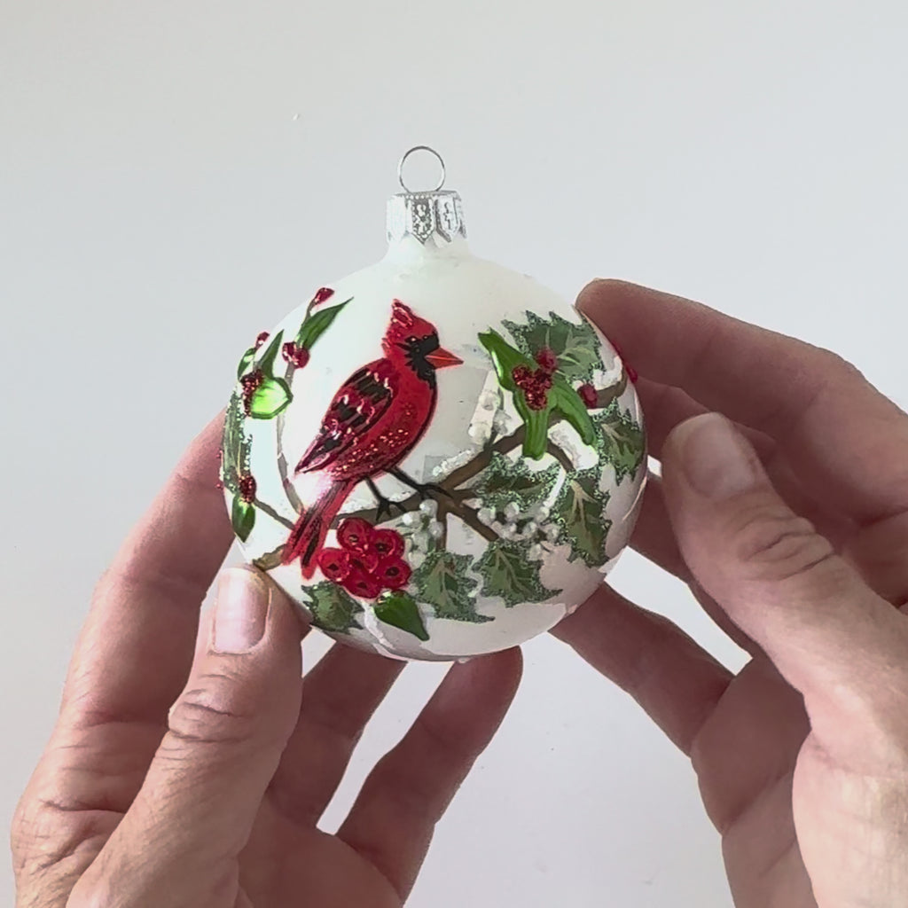 This elegant white glass Christmas ball features a bright red cardinal perched on a branch adorned with clusters of white and red berries. Some leaves are accented with touches of green or silver glitter, adding sparkle to the hand-painted detail. The design captures the beauty of winter wildlife and makes a striking addition to any Christmas tree.