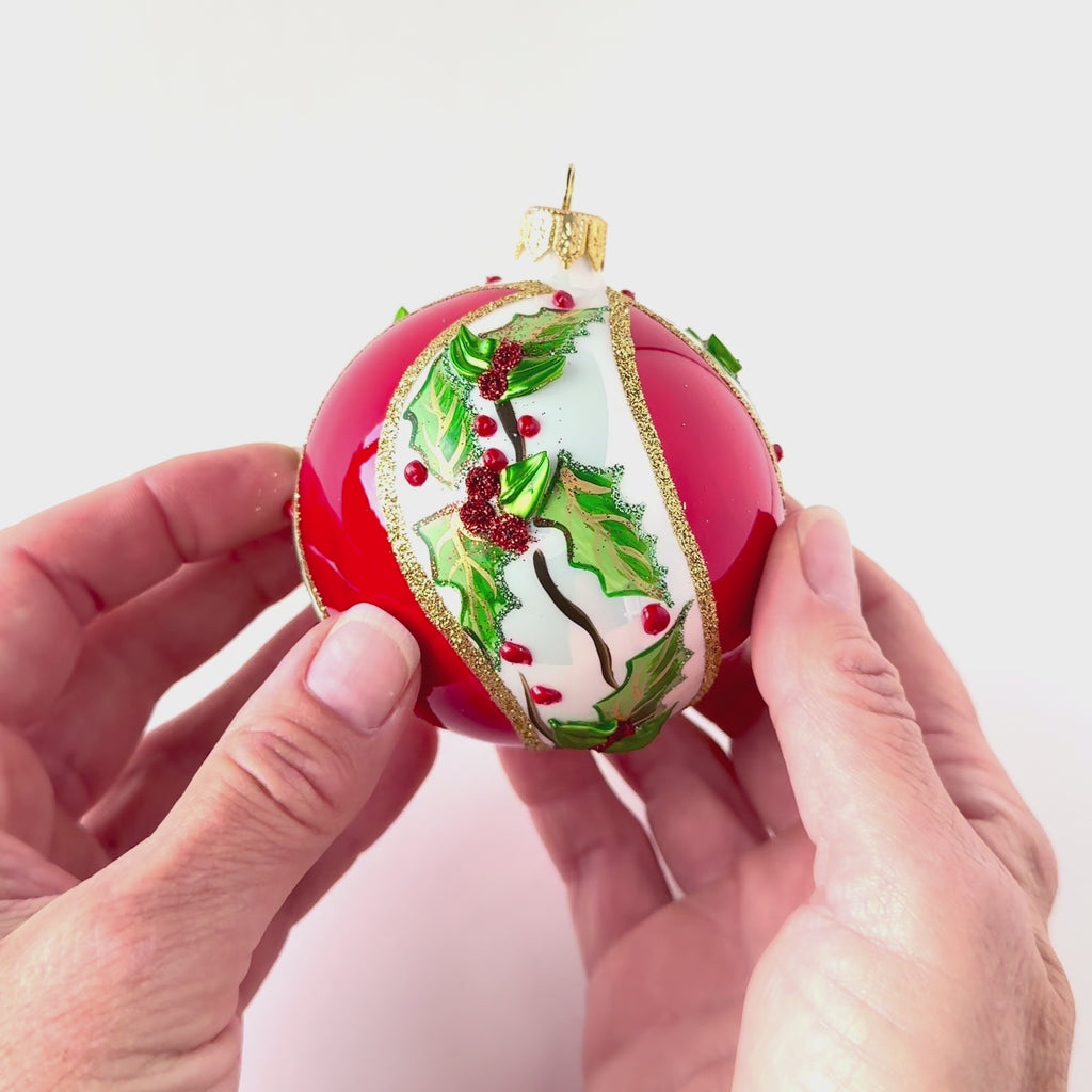Polish Blown Glass Ornament – Red Swirl Christmas Ball with Holly