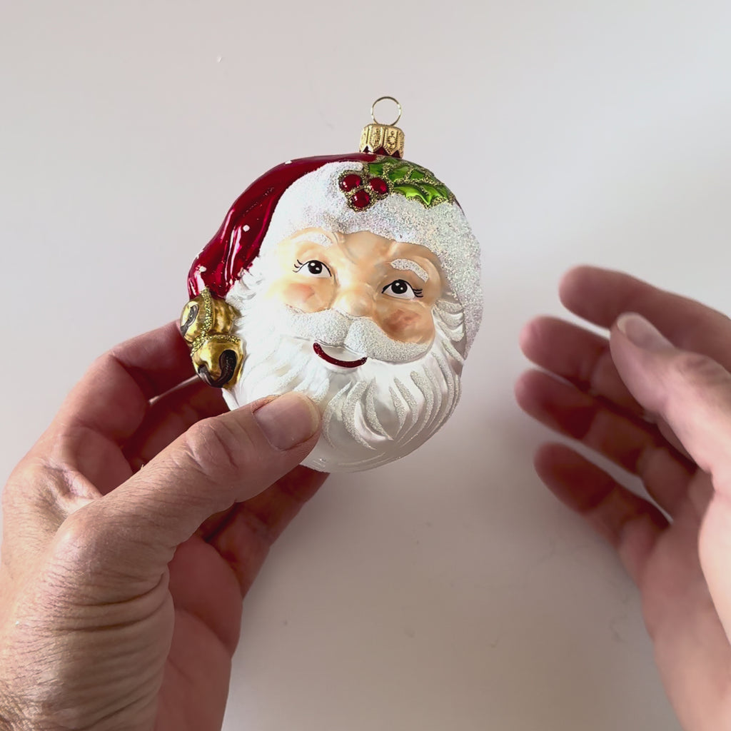 Bring the magic of Santa’s smile to your tree with this beautifully detailed ornament. Shaped like a cheerful, rosy-cheeked Santa, it features a flowing white beard, a bright red hat with glittery white trim, and a pair of decorative jingle bells at the hat’s tip. A poinsettia flower adorns the hat’s brim, adding a festive floral touch.