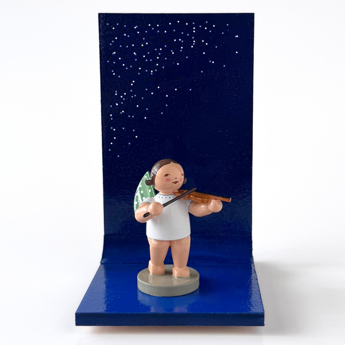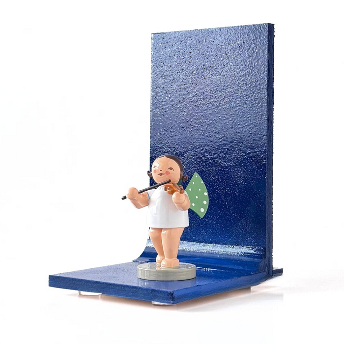 Crafted to complement the beloved Wendt und Kühn Grünhainichen Angels—especially those with eleven dots on their wings—this wooden display unit provides a graceful backdrop for one small figure. The upright panel, painted in deep midnight hues and scattered with tiny stars, creates a magical setting that highlights the charm of your collectible. While designed with Wendt und Kühn in mind, this stand is equally lovely for showcasing other cherished miniatures or keepsake ornaments.