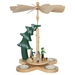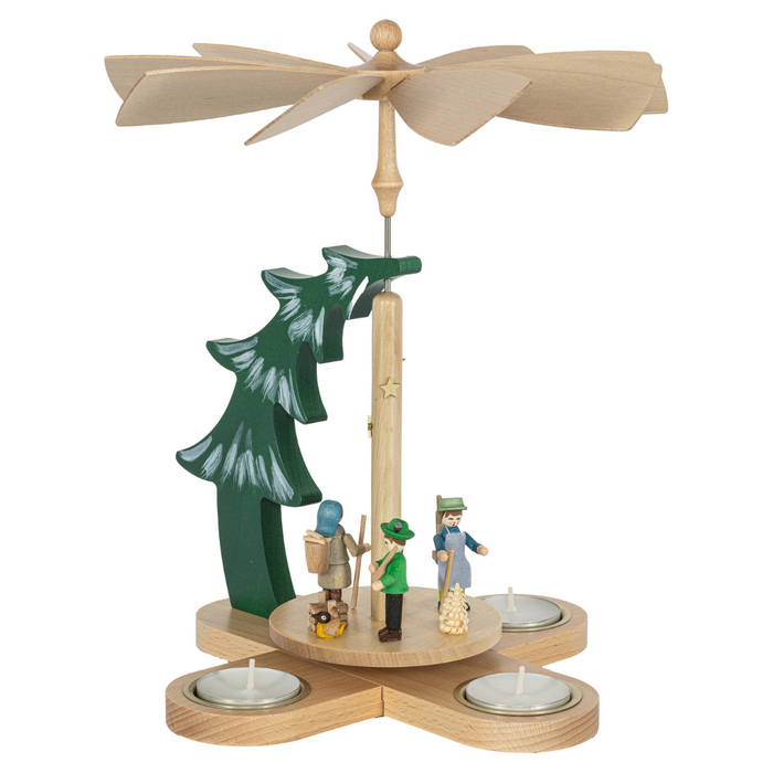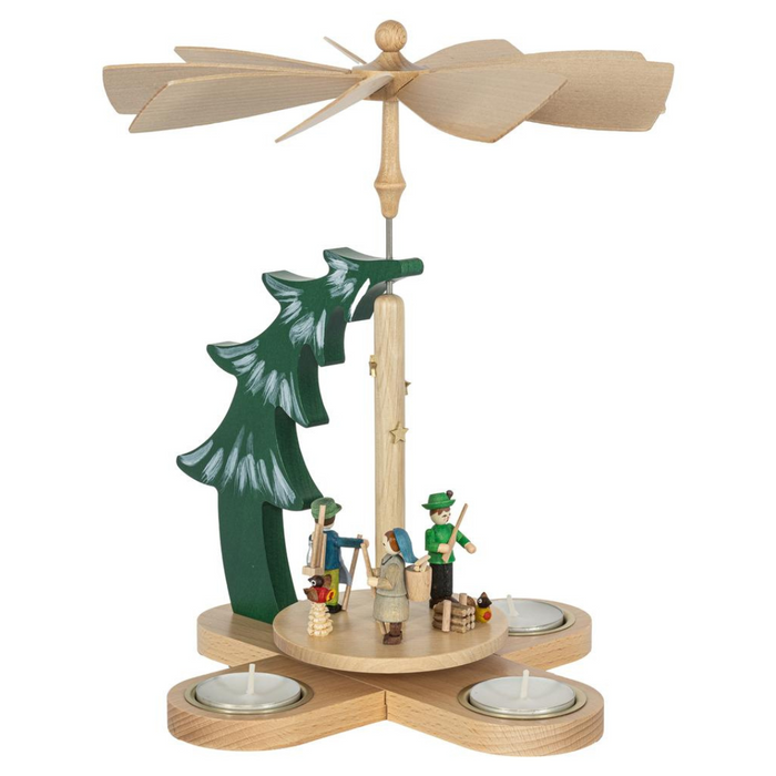 This Richard Glässer Traditional Christmas Pyramid brings the charm of Bavarian woodland life to your holiday décor. Standing as a single-tier pyramid powered by tealight candles, the fan is supported by a carved and painted pine tree, bending under the weight of the fan and snow, creating a whimsical winter scene. On the spinning circular plate below, three tiny figures are carefully arranged: a Bavarian hunter in his traditional green attire with a rifle, a woman with a basket and stick, and a man with a wood frame backpack for collecting firewood. Each figure is delicately crafted with fine details, from the folds of their clothes to the tiny tools they carry, making this pyramid a unique celebration of Bavarian heritage. This beautifully detailed scene, when lit by tealights, creates a warm, magical atmosphere perfect for any holiday home.