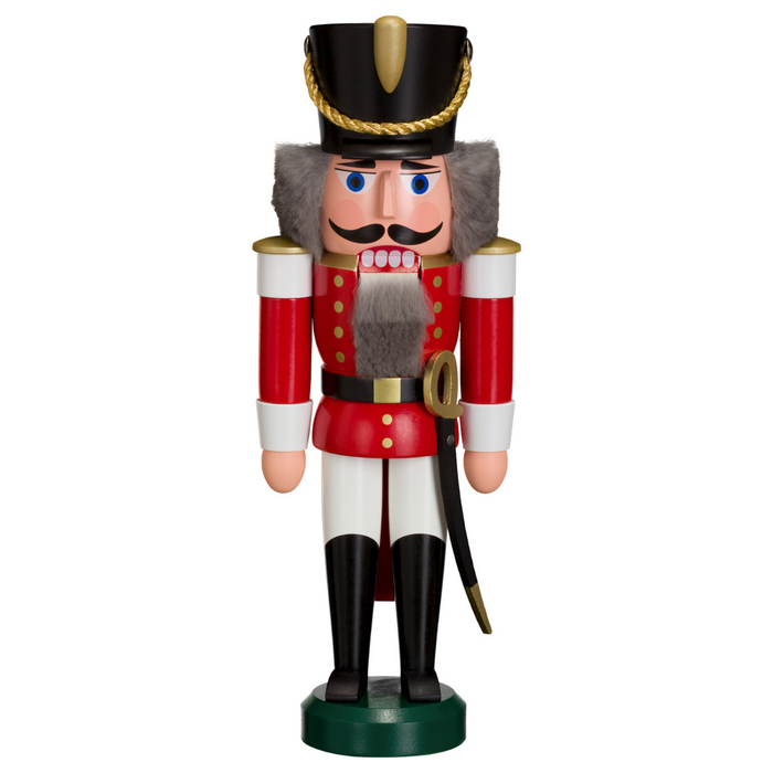 Clad in a vivid red tunic with crisp white trim, this Red Hussar Nussknacker makes a bold and classic addition to any Christmas collection. Standing 28 cm tall, he features a ceremonial sword at his side, a proud gold-trimmed helmet, and a distinguished gray beard. His bright colours and stately stance reflect the elegance and strength of traditional German craftsmanship, making him a standout in any festive display.