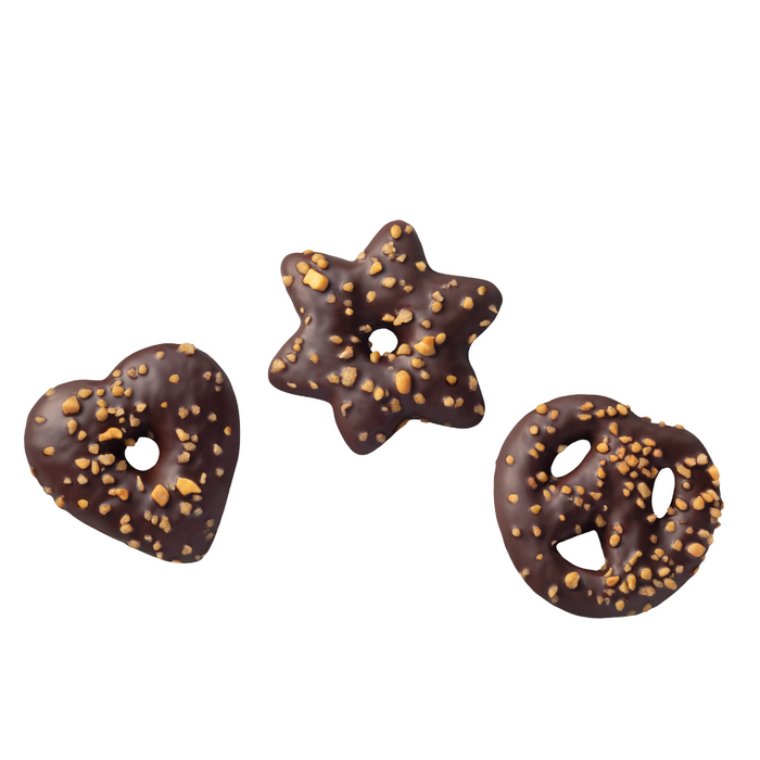 This festive bag of Wicklein Lebkuchen brings together the best of tradition and flavour—dark chocolate-coated mini gingerbread hearts, stars, and pretzels, dusted with almond brittle for added crunch. These lightly spiced German cookies are extra moist, premium quality, and made by the legendary Wicklein bakery in Nuremberg, where Lebkuchen has been perfected since 1615. A cozy treat with coffee, a thoughtful gift, or a creative touch to your Christmas garland décor.