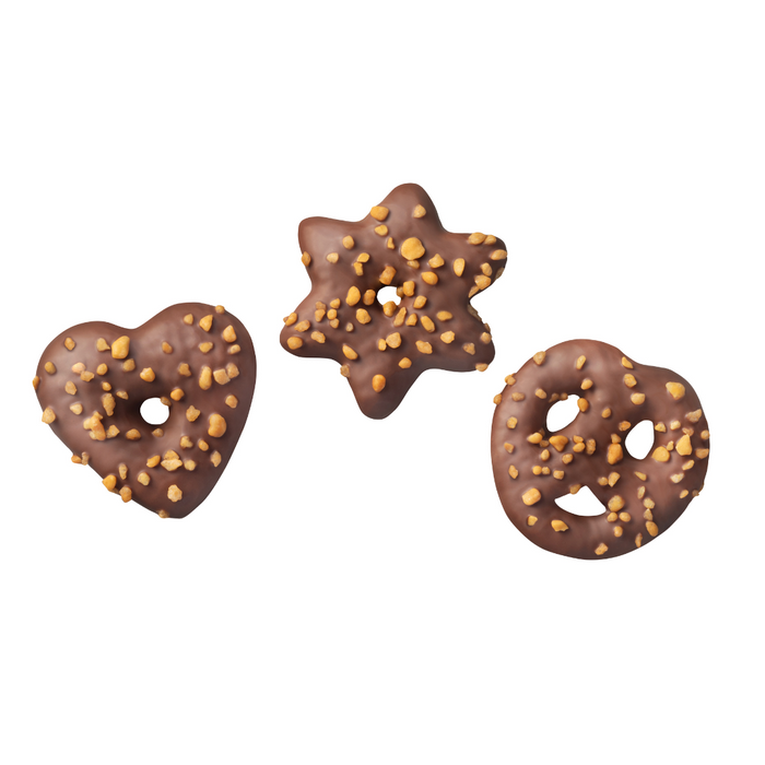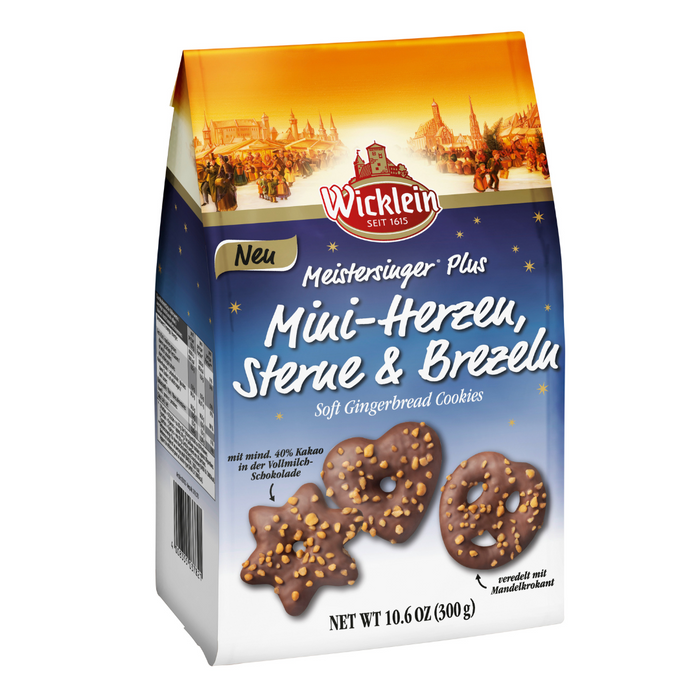 Bring festive charm and irresistible flavour to your holiday season with this delightful assortment of mini Lebkuchen in heart, star, and pretzel shapes—coated in rich milk chocolate and sprinkled with crunchy almond brittle. Baked in Nuremberg by Wicklein, Germany’s oldest Lebkuchen bakery (est. 1615), these moist, lightly spiced cookies are a premium treat made with traditional recipes and a high cocoa content for extra indulgence. Enjoy them as a sweet snack, or get creative and string them together as a delicious garland for your tree or mantle.